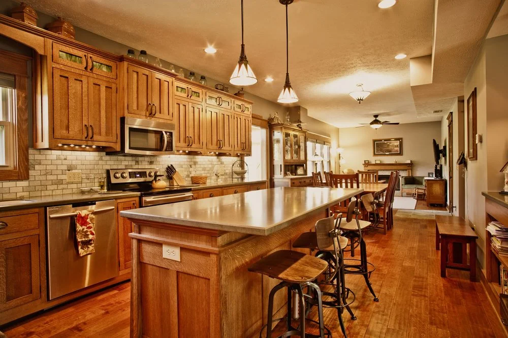 In this project, the client wanted to make an arts and crafts themed first floor. First, walls were torn down to open up the space. To carry the arts and crafts theme throughout the first floor quarter sawn cabinets and a hand-scraped wood floors were installed in the kitchen, new arts and crafts columns were added..